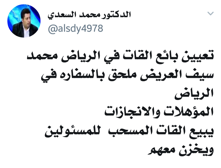 في تغريدة له على موقع التواصل الاجتماعي تويتر، قال الدكتور و السياسي الجنوبي محمد السعدي انه قد تم تعيين "بائع قات" سابق ملحقا في السفارة اليمنية بالرياض.