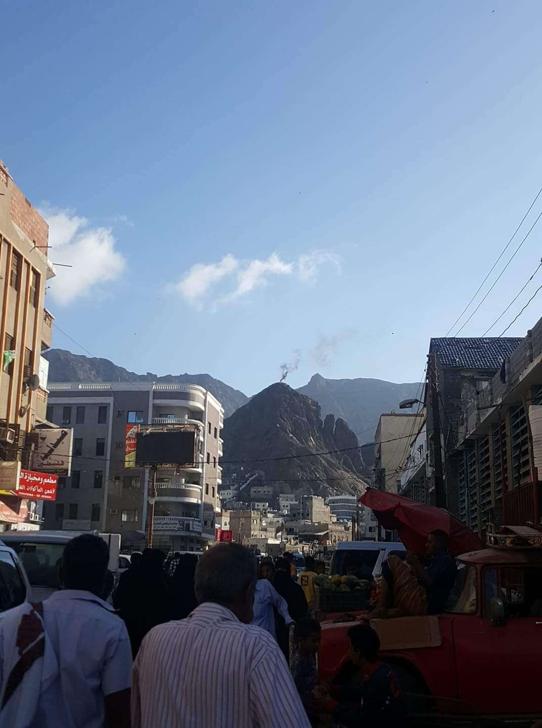 وقال مواطنون لكريتر سكاي:شوهد دخان يصاعد من راس جبل بالقرب من البوميس بكريتر(خلف منطقة الجمالة)