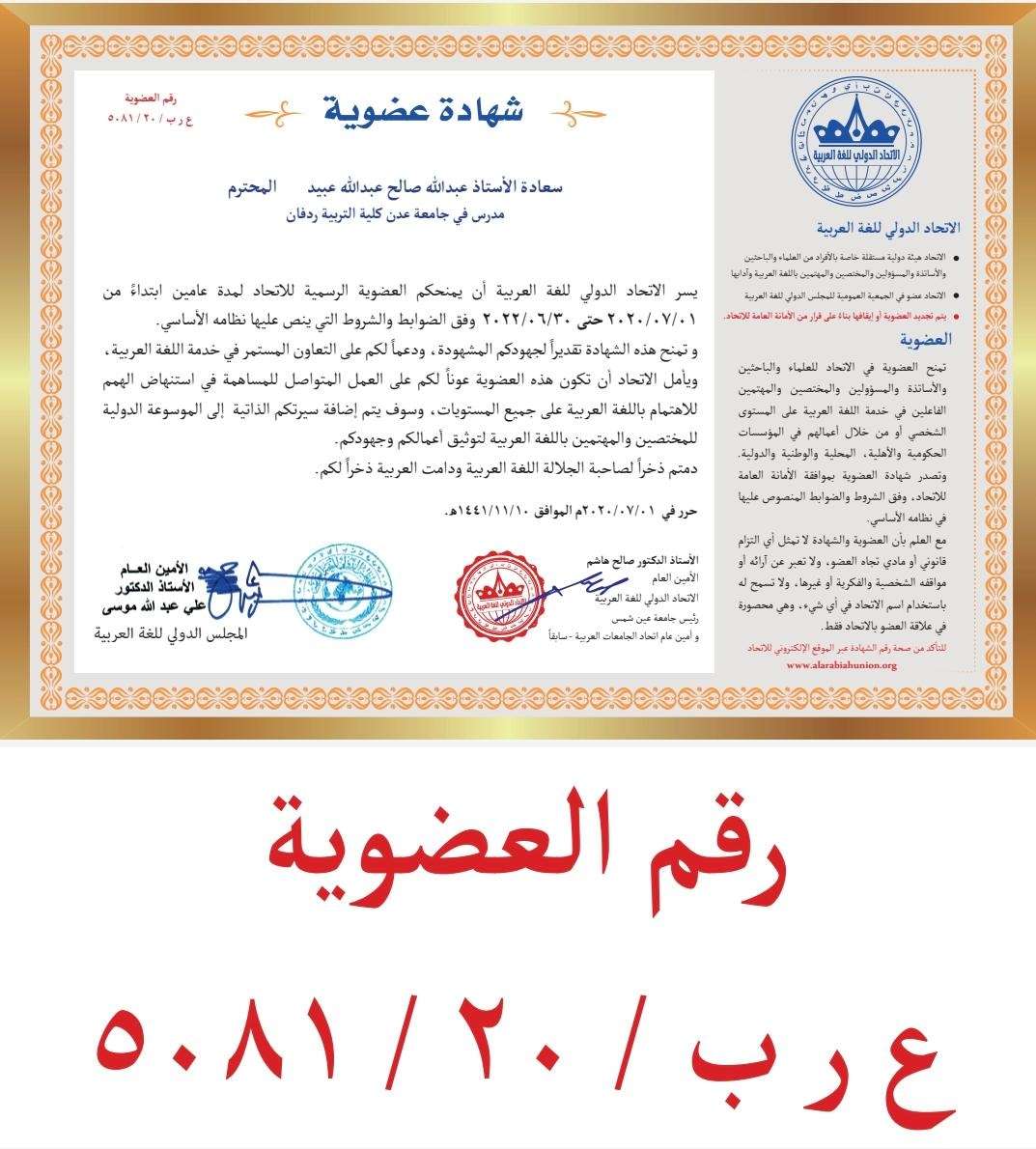 منح الاتحاد الدولي للغة العربية للأستاذ عبدالله صالح الحالمي، معيد في كلية التربية ردفان جامعة عدن تخصص لغة عربية _العضوية الرسمية للاتحاد الدولي الذي يرأسه الدكتور صالح هاشم عميد جامعة عين شمس.
