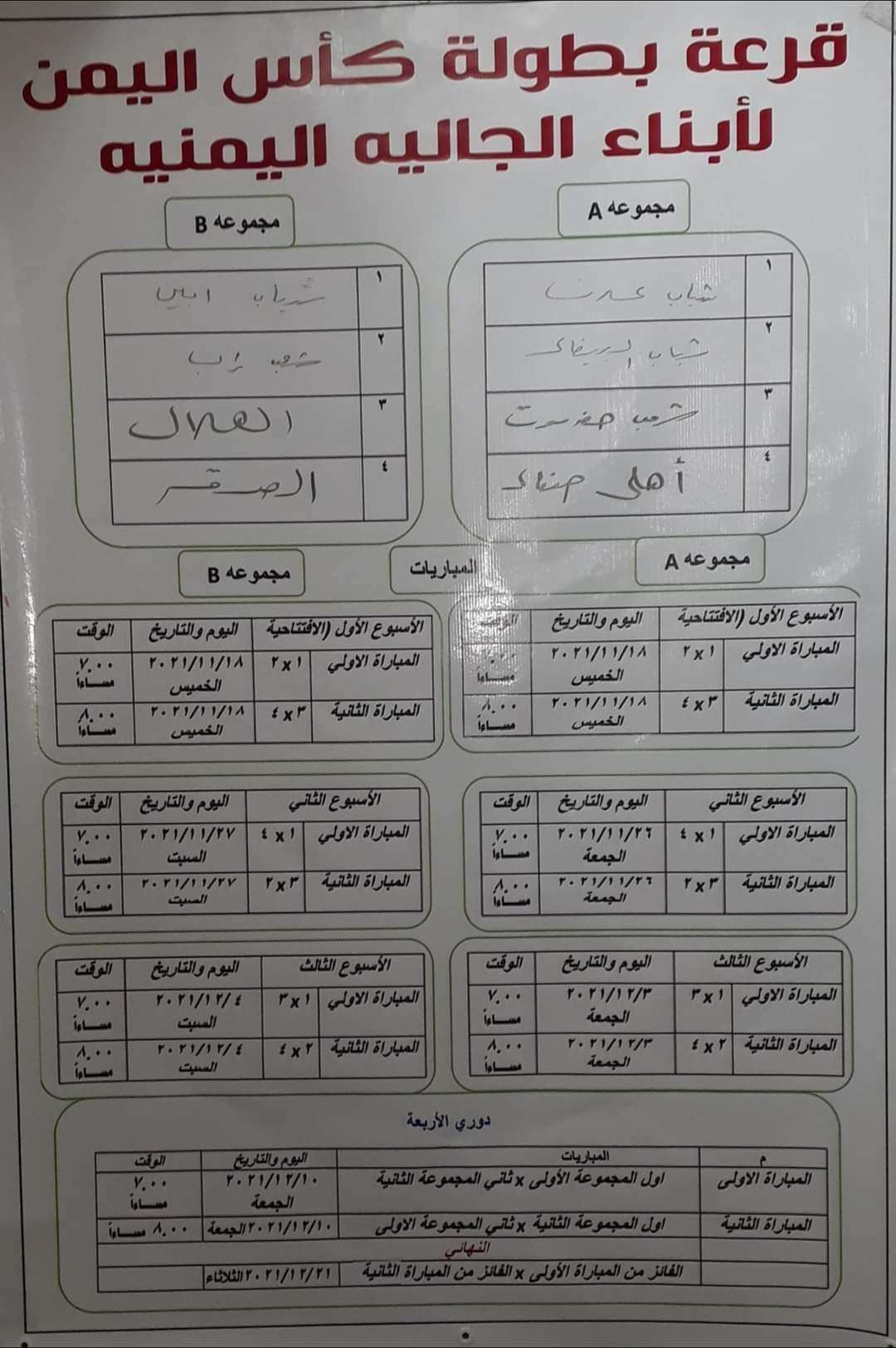 ويشارك في البطولة التي تحمل اسم كأس اليمن ٨ فرق تمثل ابناء الجالية بالقاهرة تلعب في مجموعتين من دور واحد لتحديد المتأهلين لدور نصف النهائي.