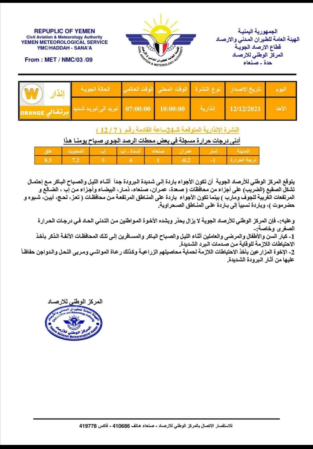 يتوقع المركز الوطني للأرصاد الجوية أن تكون الأجواء باردة إلى شديدة البرودة جداَ أثناء الليل والصباح الباكر مع إحتمال تشكل الصقيع (الضريب) على أجزاء من محافظات ( صعدة، عمران، صنعاء، ذمار، البيضاء وأجزاء من إب ، الضالع و المرتفعات الغربية للجوف ومارب ) بينما تكون الأجواء باردة على المناطق المرتفعة من محافظات ( تعز، لحج، أبين، شبوه و حضرموت )، وباردة نسبياً إلى باردة على المناطق الصحراوية.