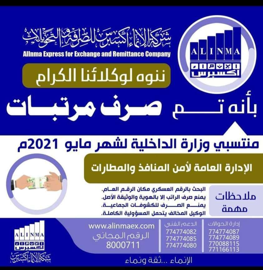 اعلنت وزارة الداخلية عن بدء صرف مرتبات منتسبي الوزارة لشهر مايو 2021م .