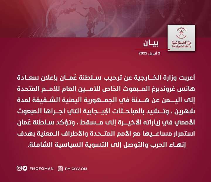 أول تعليق رسمي من سلطنة عمان على الهدنة الإنسانية باليمن السبت ٠٢ أبريل ٢٠٢٢ الساعة ٠٢:٠٩ مساءً حفظ الصورة كريتر سكاي /خاص رحبت سلطنة عمان بإعلان الهدنة الانسانية في اليمن. وأكدت السلطنة استمرار مساعيها مع الأمم المتحدة والأطراف المعنية بهدف إنهاء الحرب والتوصل إلى التسوية السياسية الشاملة. و اصدرت وزارة الخارجية بيان كما هو موضح بالصورة // // // // // قد يعجبك ايضا